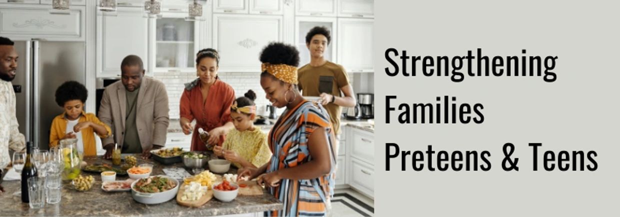 Strengthening Families is ideal for families with tweens and teens (10ish-17) and kids/teens are encouraged to attend alongside their parents. We will focus on family bonding, healthy rules and boundaries, as well as topics like stress and anger management. Taught in 10 sessions.